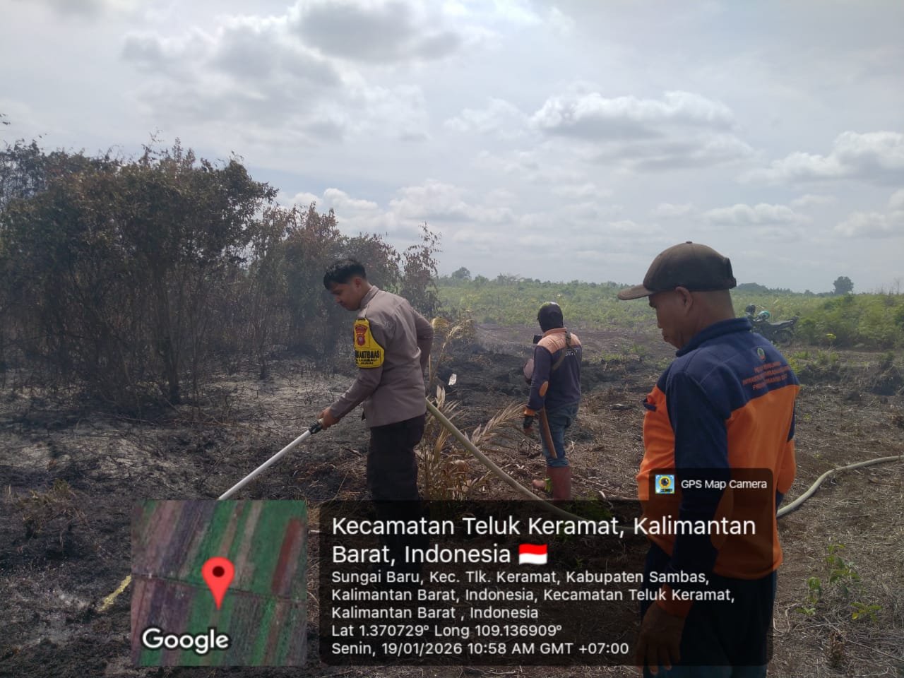 Kegiatan penanganan Karhutla yang dilaksanakan oleh bhabinkamtibmas desa lambau, bersama Tim terpantau berdasarkan monitoring Aplikasi Lancang Kuning di Desa Sarang lambau Kecamatan Jawai Kabupaten Sambas.