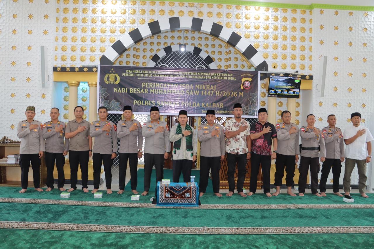 Polres Sambas, Polda Kalbar – Keluarga besar Polres Sambas menggelar peringatan Isra Mi’raj Nabi Muhammad SAW 1447 H secara khidmat di Masjid Al Ikhlas Darussalam Polres Sambas, pada Jumat (23/01/2026) pukul 08.30 WIB. Kegiatan ini menjadi momentum refleksi bagi personel Polri untuk menginternalisasi nilai ibadah guna meningkatkan kualitas pelayanan kepada masyarakat.