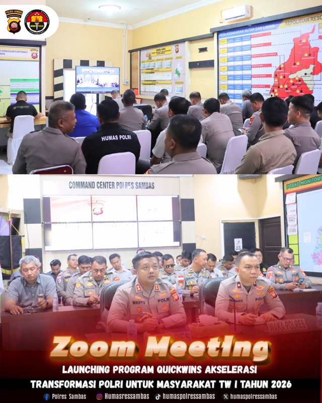 Polres Sambas, Polda Kalbar – Dalam upaya peningkatan kualitas pelayanan Kepolisian kepada masyarakat, Polres Sambas mengikuti kegiatan Launching Program Quick Wins Akselerasi Transformasi Polri untuk Masyarakat Triwulan (TW) I Tahun 2026 melalui Zoom Meeting. Kegiatan ini berlangsung di Aula Bharadaksa Polres Sambas pada Kamis (29/1/2026).