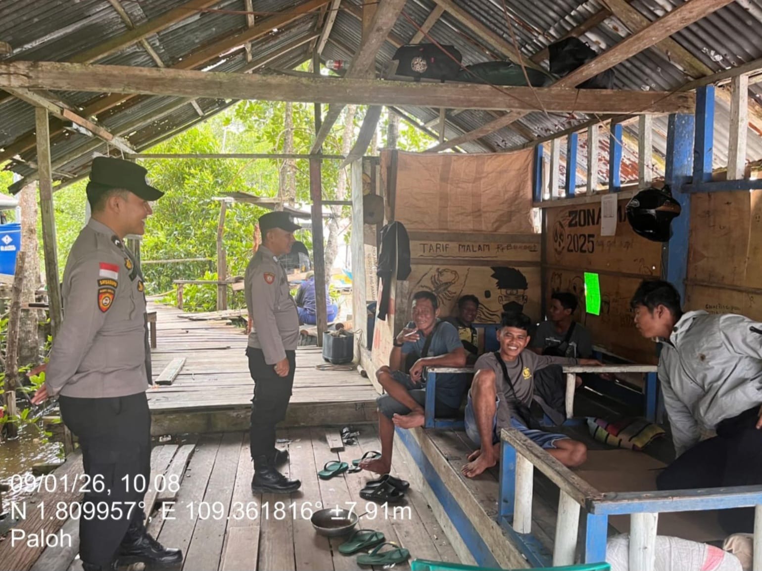 Personel Polsek Paloh Bripka Dedi Hariadi bersama rekannya melaksanakan patroli diberbagai lokasi yang dianggap rawan kamtibmas yaitu tempat berkumpulnya masyarakat di desa nibung kecamatan paloh. Jumat, 9/1/26.