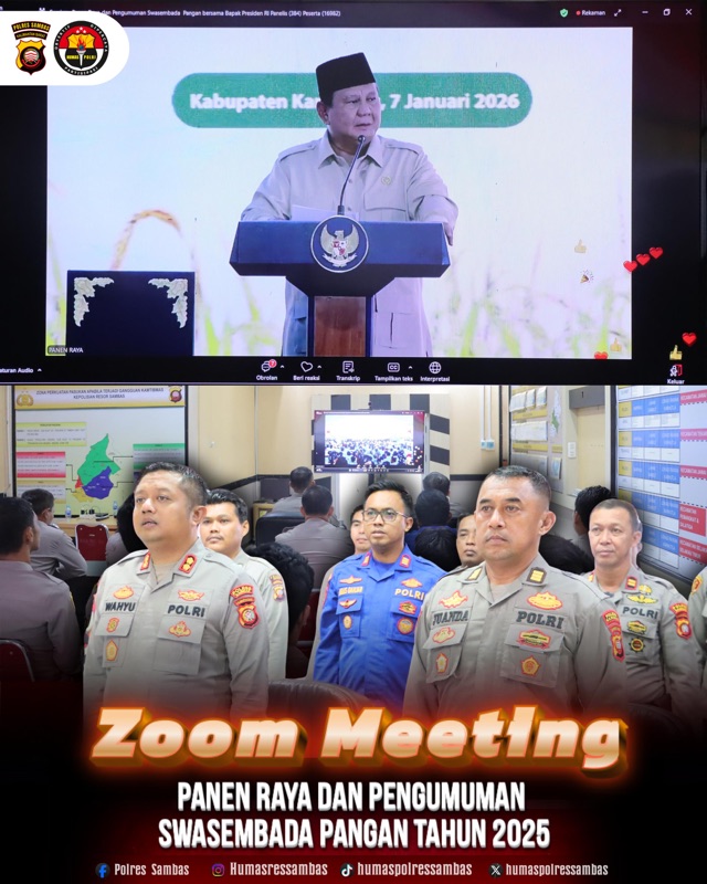 SAMBAS – Polres Sambas mengikuti kegiatan Zoom Meeting Panen Raya dan Pengumuman Swasembada Pangan Tahun 2025 yang dipimpin langsung oleh Presiden Republik Indonesia, H. Prabowo Subianto. Kegiatan ini berlangsung khidmat di Balai Bharadaksa Polres Sambas pada Rabu (07/01/2026) siang.