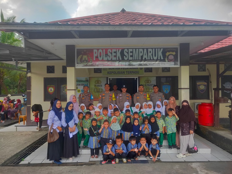 Kunjungan anak-anak TK Hubbul Wathon ke Polsek Semparuk didampingi oleh para guru dan orang tua anak, kegiatan kunjungan berjalan lancar.