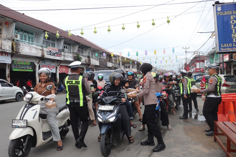 Dengan senyum ramah, para anggota membagikan paket takjil kepada pengendara roda dua, roda empat, hingga masyarakat sekitar yang melintas di depan Pos Lantas Polres. Aksi sederhana ini menjadi wujud kepedulian dan kedekatan Polri dengan masyarakat, khususnya di bulan suci Ramadan yang penuh berkah.