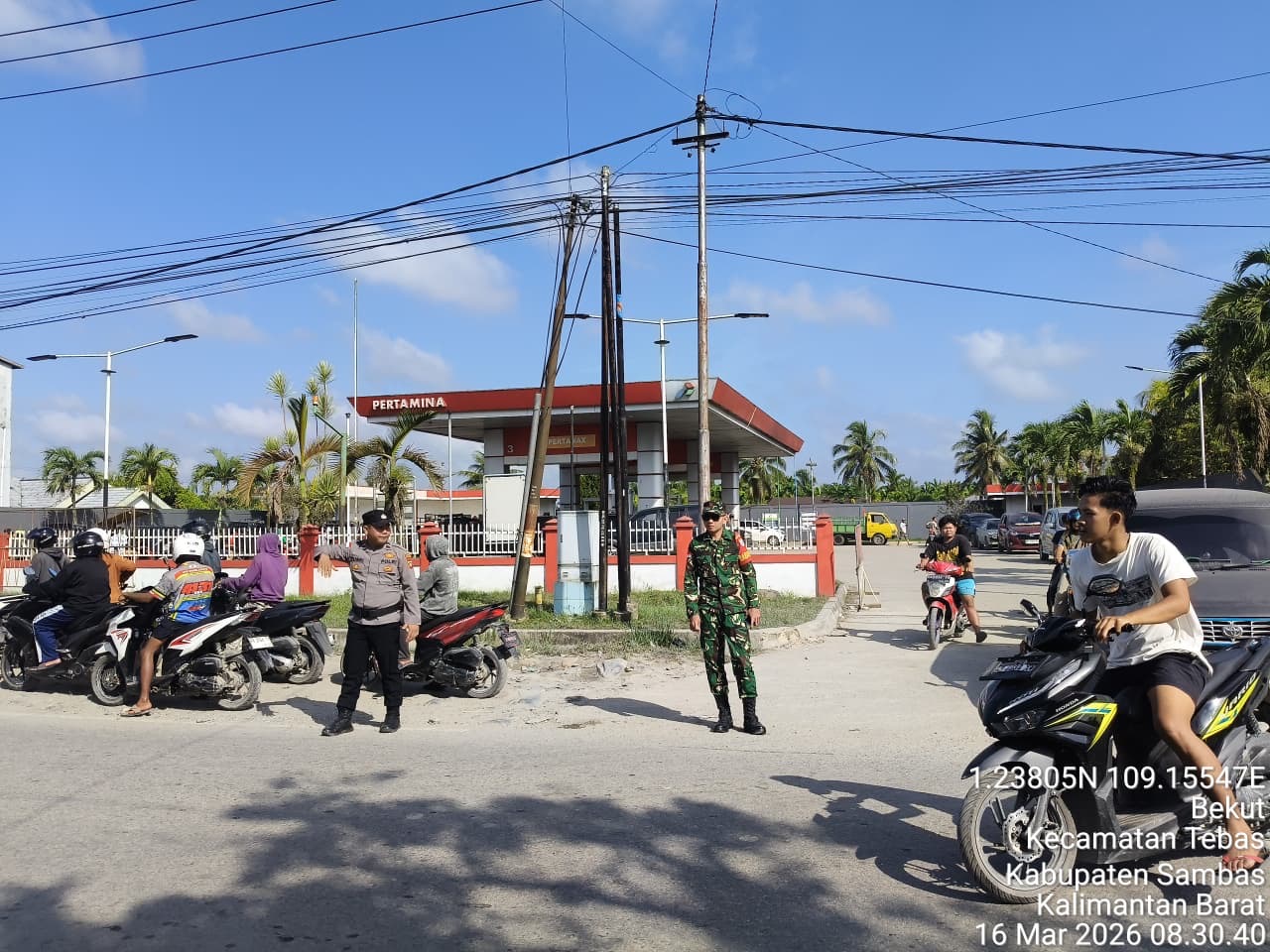 Tribratanews.polri.go.id.polda kalbar.polres sambas.polsek tebas-Untuk mengantisipasi gangguan keamanan dan ketertiban masyarakat serta kemacetan akibat isu kelangkaan bahan bakar minyak (BBM), anggota Polsek Tebas melaksanakan kegiatan pengamanan di SPBU yang berada di Desa Bekut, Kecamatan Tebas, Senin pagi, 16 Maret 2026.