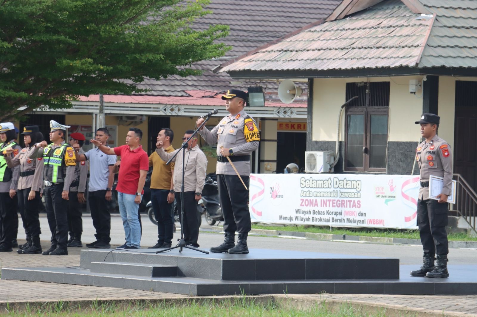 Sambas, Polda Kalbar – Polres Sambas menggelar Apel Kesiapan Pengamanan Malam Takbiran menyambut Hari Raya Idul Fitri 1447 H tahun 2026. Kegiatan di halaman Mapolres Sambas pada Jumat (20/03/2026) sore ini, dipimpin langsung Kapolres Sambas AKBP Wahyu Jati Wibowo, S.I.K., S.H., M.H., dihadiri jajaran Pejabat Utama (PJU) serta personel gabungan Polres hingga Polsek jajaran.