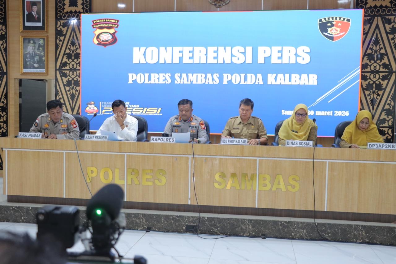 Sambas, Polda Kalbar – Polres Sambas menggelar konferensi pers pada Senin tanggal 30 Maret 2026 untuk menyampaikan perkembangan penanganan kasus dugaan tindak pidana kekerasan dalam lingkup rumah tangga yang dilakukan oleh seorang anak, Sdr. R (17 tahun 3 bulan), terhadap ibu kandungnya, Sdri. S (52), pada Senin 16 Maret 2026 sekira pukul 09.20 Wib di Kec. Tlk. Keramat. Senin (30/03/2026)