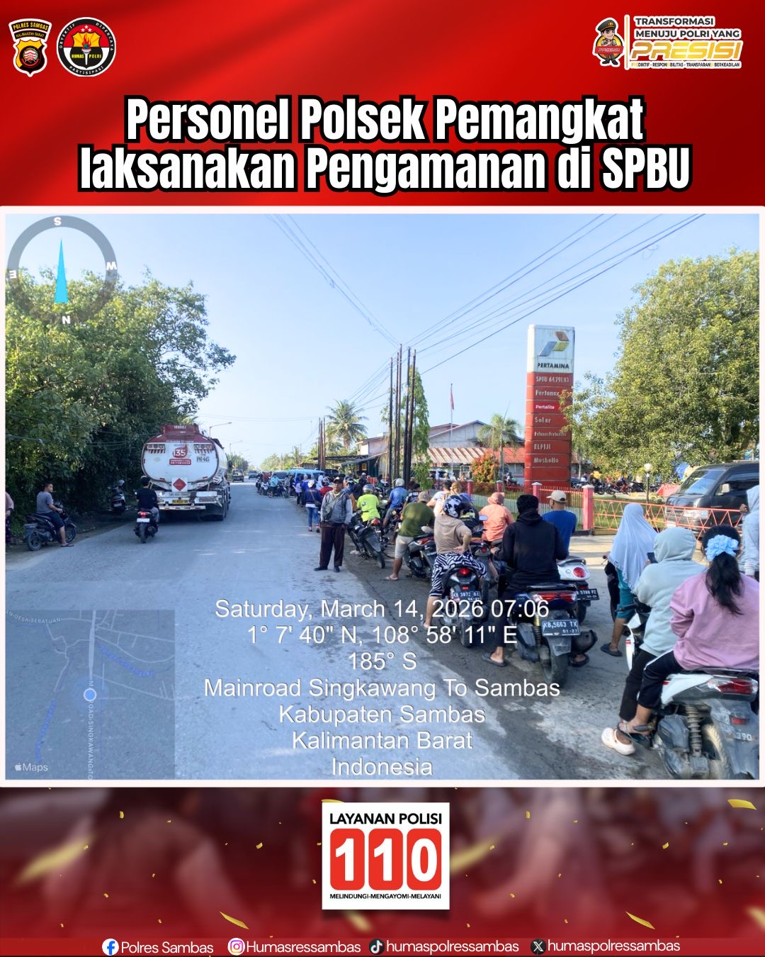 Sambas, Polda Kalbar – Personel Polsek Pemangkat Polres Sambas melaksanakan pengecekan, patroli, dan pengamanan distribusi Bahan Bakar Minyak (BBM) di seluruh SPBU wilayah hukum (wilkum) Polsek Pemangkat, pada Sabtu (14/3/2026) pukul 06.00 WIB hingga 16.30 WIB.