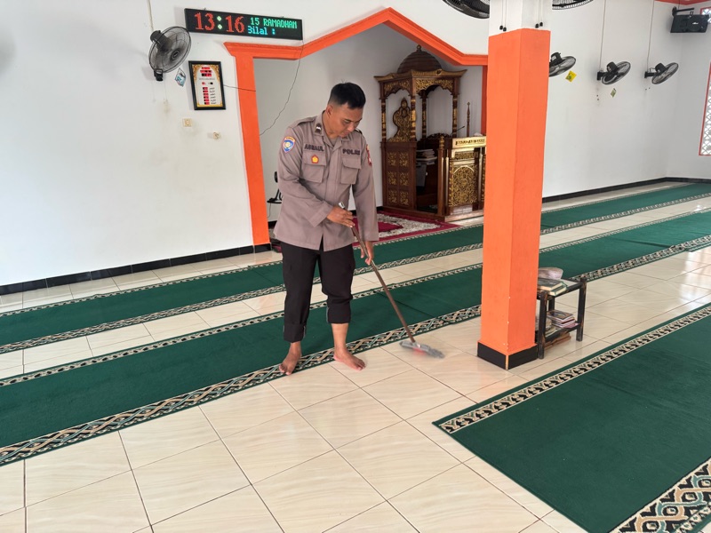 Dalam kegiatan tersebut, personel Polsek Sajad bergotong-royong membersihkan area masjid, mulai dari bagian dalam hingga halaman,