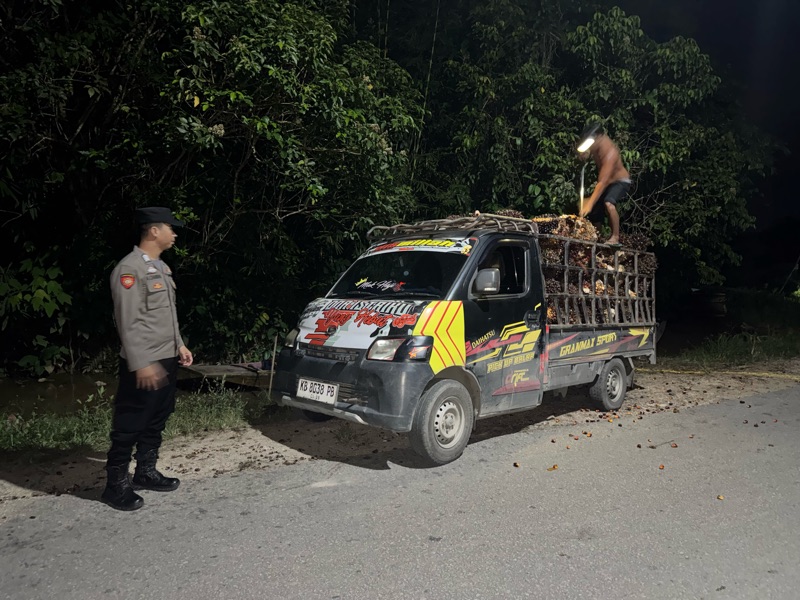 **SAJAD** – Personel Piket Polsek Sajad melaksanakan kegiatan patroli dialogis dan pemberian imbauan kepada para pengemudi angkutan buah sawit di wilayah hukum Polsek Sajad, Senin (20/4/2026) malam.