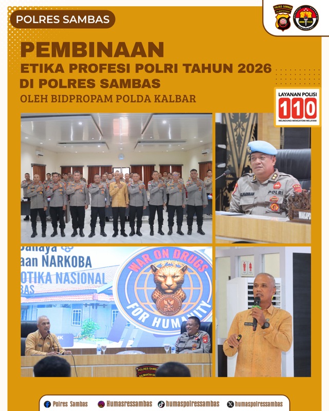 Sambas, Polda Kalbar – Polres Sambas menyambut kunjungan Tim Bidpropam Polda Kalimantan Barat dalam rangka Pembinaan Etika Profesi Polri Tahun 2026. Kegiatan yang digelar di Aula Dhira Wijaya Polres Sambas pada Kamis (9/4/2026) ini bertujuan memperkuat disiplin dan memastikan seluruh personel berpegang teguh pada koridor hukum serta etika profesi yang berlaku. Hadir dalam kegiatan tersebut Wakapolres Sambas Kompol Hilman Malaini, S.H., S.I.K., M.H., PJU Polres Sambas, Kapolsek Jajaran, Kanit Propam Polsek Jajaran dan Personel Polres Sambas.
