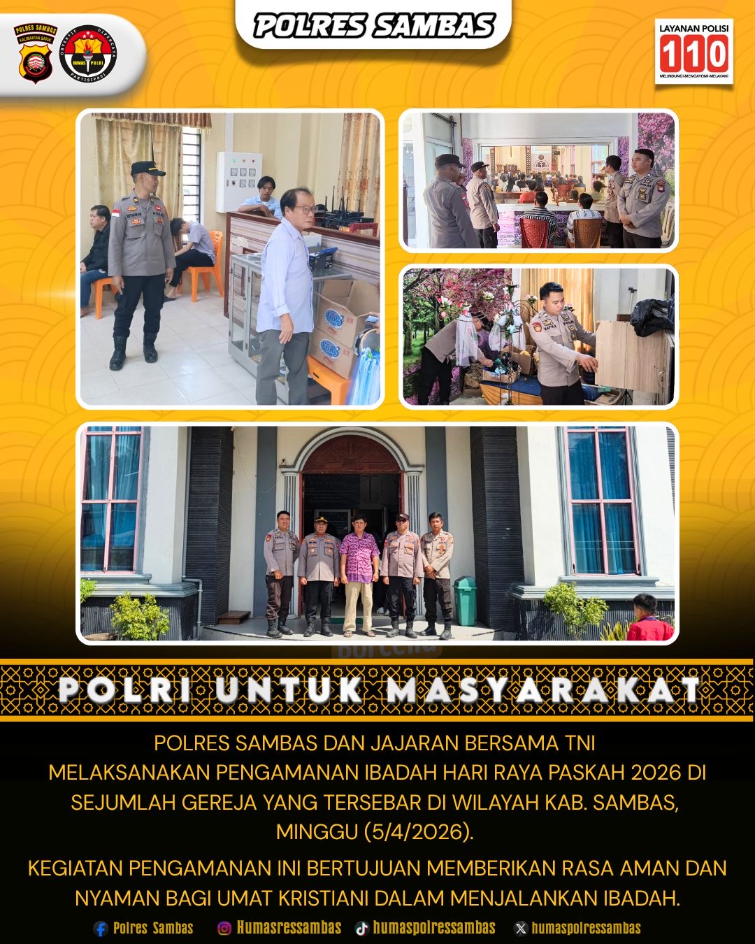 Demi pengamanan Ibadah/Misa Hari Raya Paskah yang aman dan khidmat, Polres Sambas mengerahkan 129 personel dari Polres dan Polsek jajaran yang tersebar di seluruh Kabupaten Sambas, disesuaikan dengan jadwal kebaktian umat Kristiani di berbagai gereja. Pengamanan ini bersinergi erat dengan TNI (Kodim 1208/SBS Sambas) beserta jajarannya, mewujudkan kolaborasi solid untuk memberikan pelayanan prima bagi masyarakat.