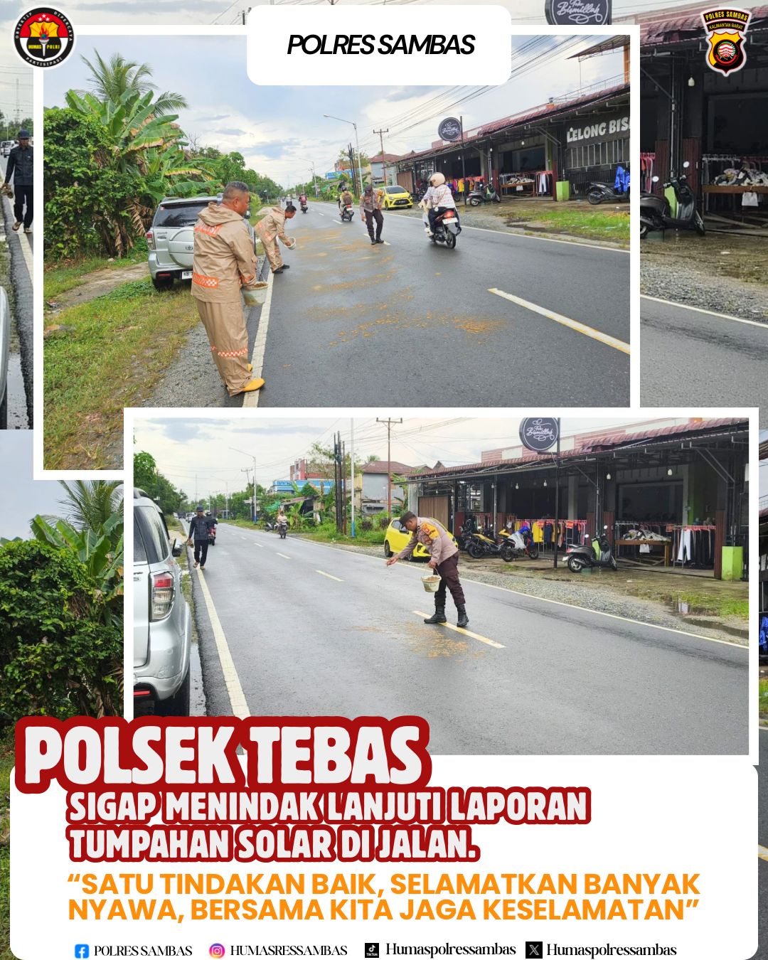 Tindakan nyata Polsek Tebas dilaksanakan berupa langsung mendatangi TKP dengan penuh dedikasi. Mengatur lalu lintas (turlalin) demi kelancaran dan keamanan, membersihkan sisa solar secara efektif, menabur pasir merata, lalu menyapu jalan sehingga kembali aman dan prima untuk dilalui.