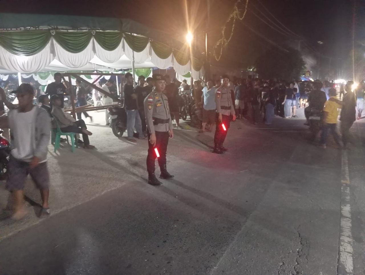 SAMBAS – Ribuan warga memadati Dusun Maksari, Desa Sebawi, Kabupaten Sambas pada Jumat malam (17/04/2026) untuk menyaksikan penampilan Band Bos Muda dalam rangka memeriahkan sebuah pesta pernikahan. Mengantisipasi lonjakan massa, pengamanan ketat dilakukan oleh personel gabungan Polres Sambas dan Polsek setempat yang dipimpin oleh Iptu S. R Saragih Simarmata sebagai Perwira Pengendali (Padal). Selama kegiatan yang berlangsung mulai pukul 19.30 hingga 23.00 WIB tersebut, sebanyak 10 personel gabungan dikerahkan untuk melakukan monitoring secara intensif guna memastikan situasi tetap terkendali di tengah antusiasme penonton.