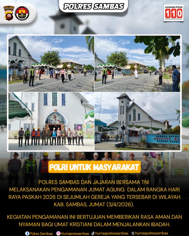 Demi pengamanan Ibadah Paskah yang aman dan khidmat, Polres Sambas mengerahkan 149 personel dari Polres dan Polsek jajaran yang tersebar di seluruh Kabupaten Sambas, disesuaikan dengan jadwal kebaktian umat Kristiani di berbagai gereja. Pengamanan ini bersinergi erat dengan Kodim 1208/SBS Sambas beserta jajarannya serta personel PLN Sambas, mewujudkan kolaborasi solid untuk memberikan pelayanan prima bagi masyarakat.